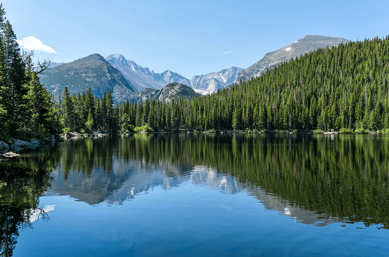 Calm mountain lake with clear reflections under a blue sky.