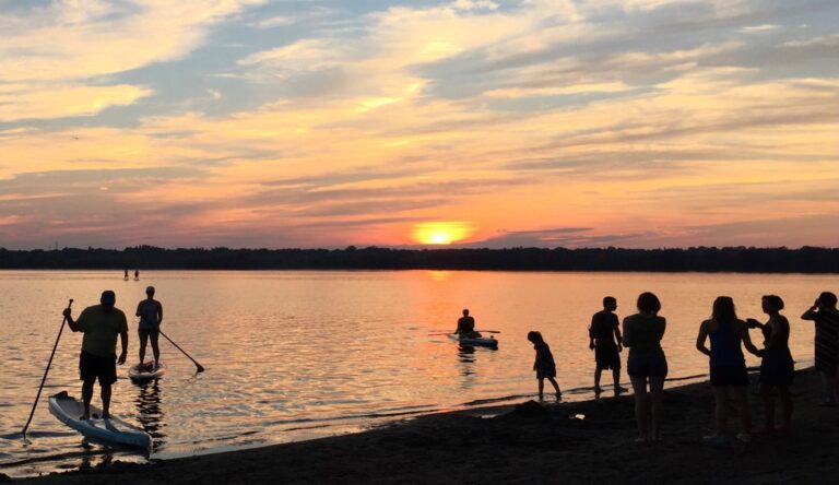 People enjoying sunset by the lake.